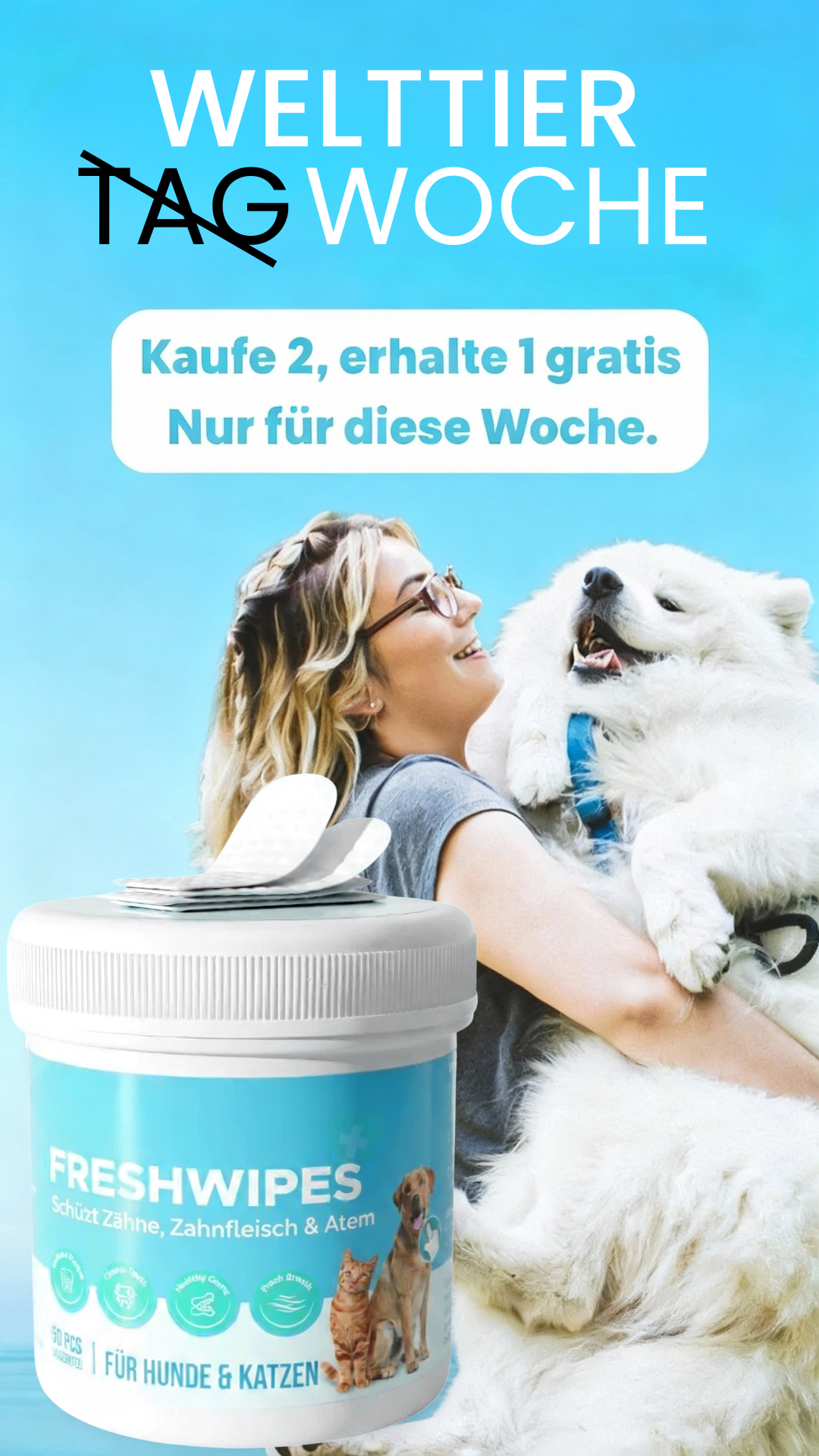 FreshWipes ist eine einfache und sichere Lösung für die Mundhygiene deines Hundes. Wir möchten, dass du und dein Hund zufrieden seid – deshalb bieten wir eine 100-Tage-Zufriedenheitsgarantie an. Unsere Tücher sind sowohl effektiv als auch sanft und passen perfekt auf deinen Finger, um die Anwendung zu erleichtern. Schenke deinem Hund eine schmerzfreie Zukunft mit einem Produkt, dem du vertrauen kannst – völlig risikofrei!